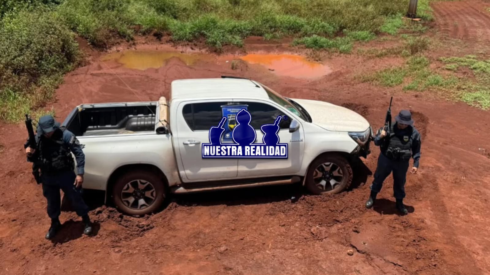 Por volta das 11h, os policiais localizaram uma caminhonete Toyota Hilux, de cor branca, atolada em uma lavoura às margens da rodovia. Após consulta aos sistemas policiais, foi constatado que o veículo possuía registro de furto ocorrido na madrugada do mesmo dia, no município de Caarapó/MS.