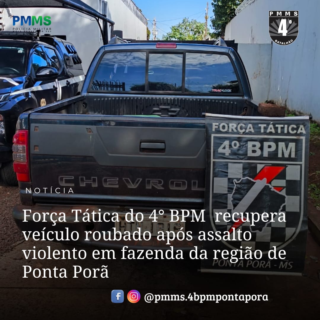 Ponta Porã (MS) – Na manhã desta segunda-feira (16), por volta das 08h45, Policiais Militares da Força Tática do 4° Batalhão de Polícia Militar recuperaram uma camionete que havia sido roubada durante um assalto ocorrido na última sexta-feira (13), em uma propriedade rural na região de Ponta Porã, Mato Grosso do Sul.