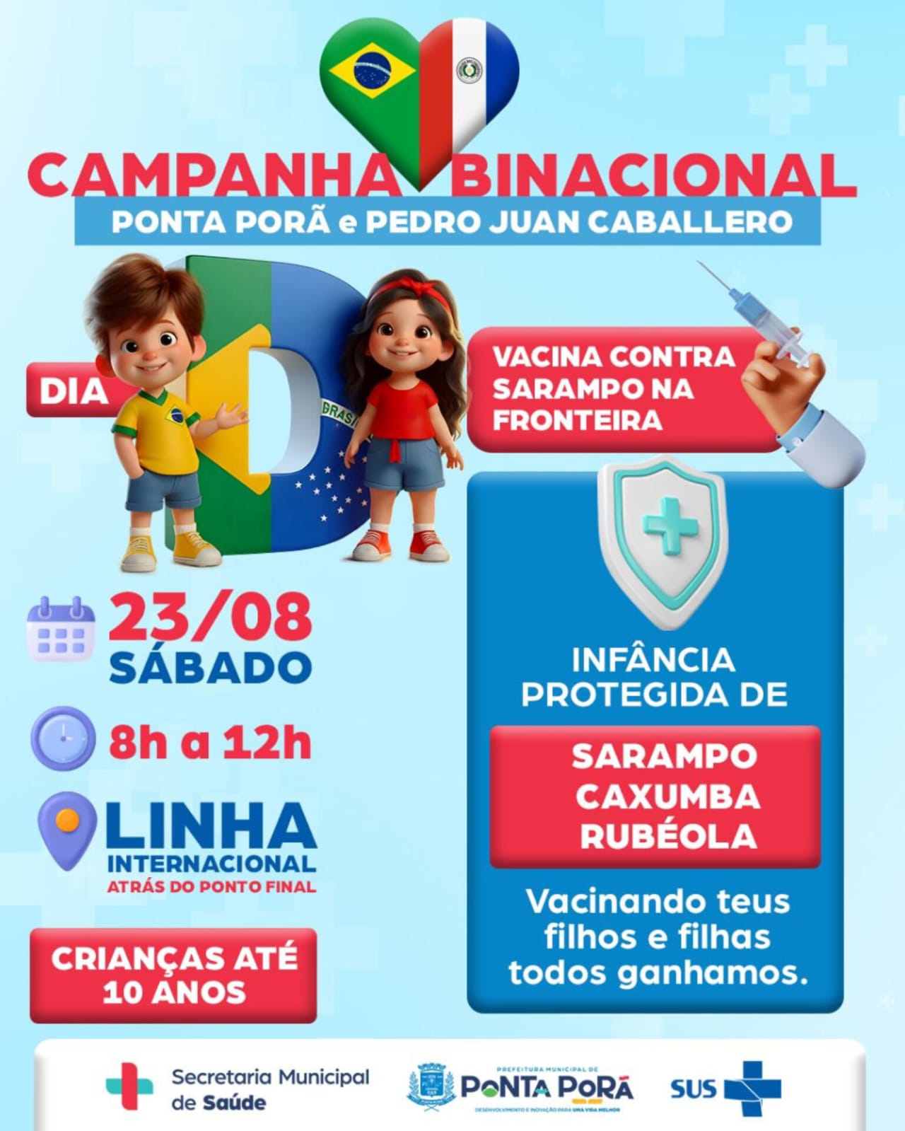 Neste sábado, dia 23 de agosto, será realizada a campanha de vacinação binacional na linha de fronteira entre Ponta Porã e Pedro Juan Caballero. A ação tem como objetivo mobilizar as comunidades dos dois países para a vacinação de crianças de até 10 anos de idade contra Sarampo, Caxumba e Rubéola.