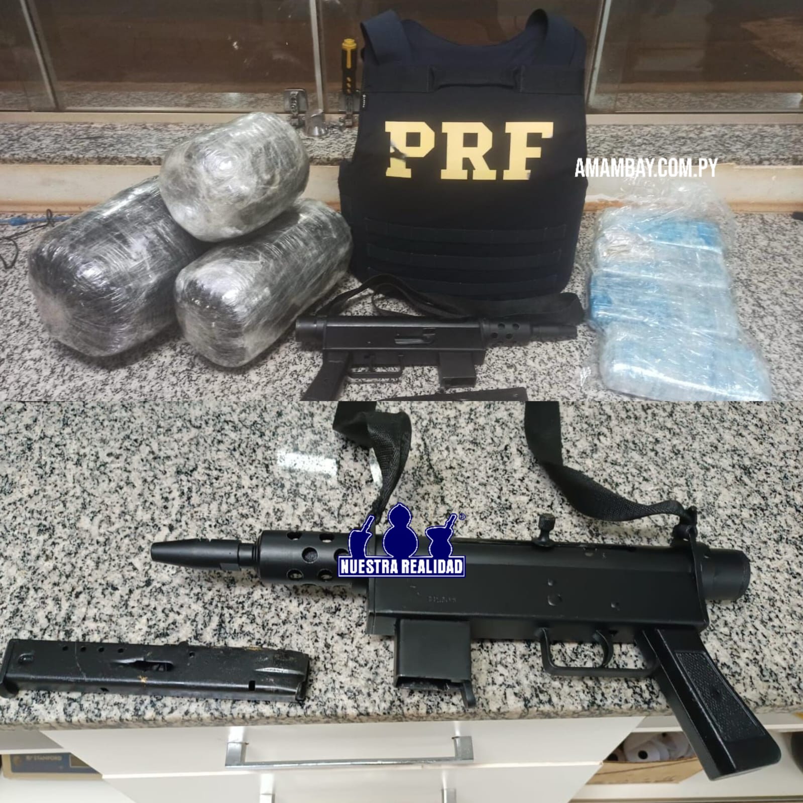 Durante revista nas bagagens do homem, foram encontrados 4,15 quilos de cocaína, 5,65 quilos de haxixe e uma submetralhadora de fabricação sueca, calibre 9mm.