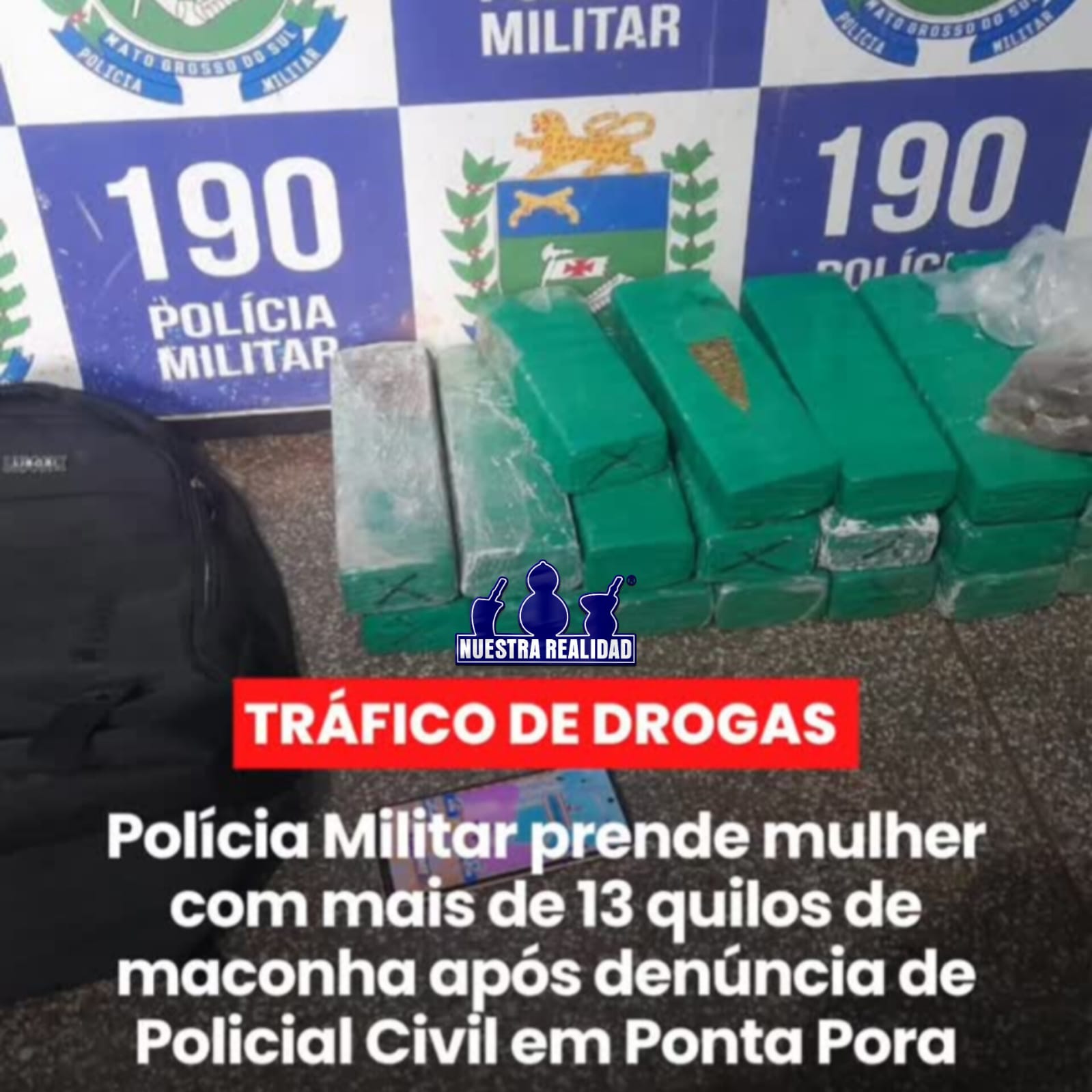 Ponta Porã (MS) – Na quinta-feira (13), a Polícia Militar de Ponta Porã prendeu uma mulher de 27 anos pelo crime de tráfico de drogas, após ser flagrada transportando 22 tabletes de maconha em uma mochila. A ação, realizada no Residencial Ponta Porã I, foi desencadeada após denúncia feita por um Policial Civil, que identificou o entorpecente durante uma revista em bagagens antes de uma viagem que realizaria através de veículo de aplicativo.