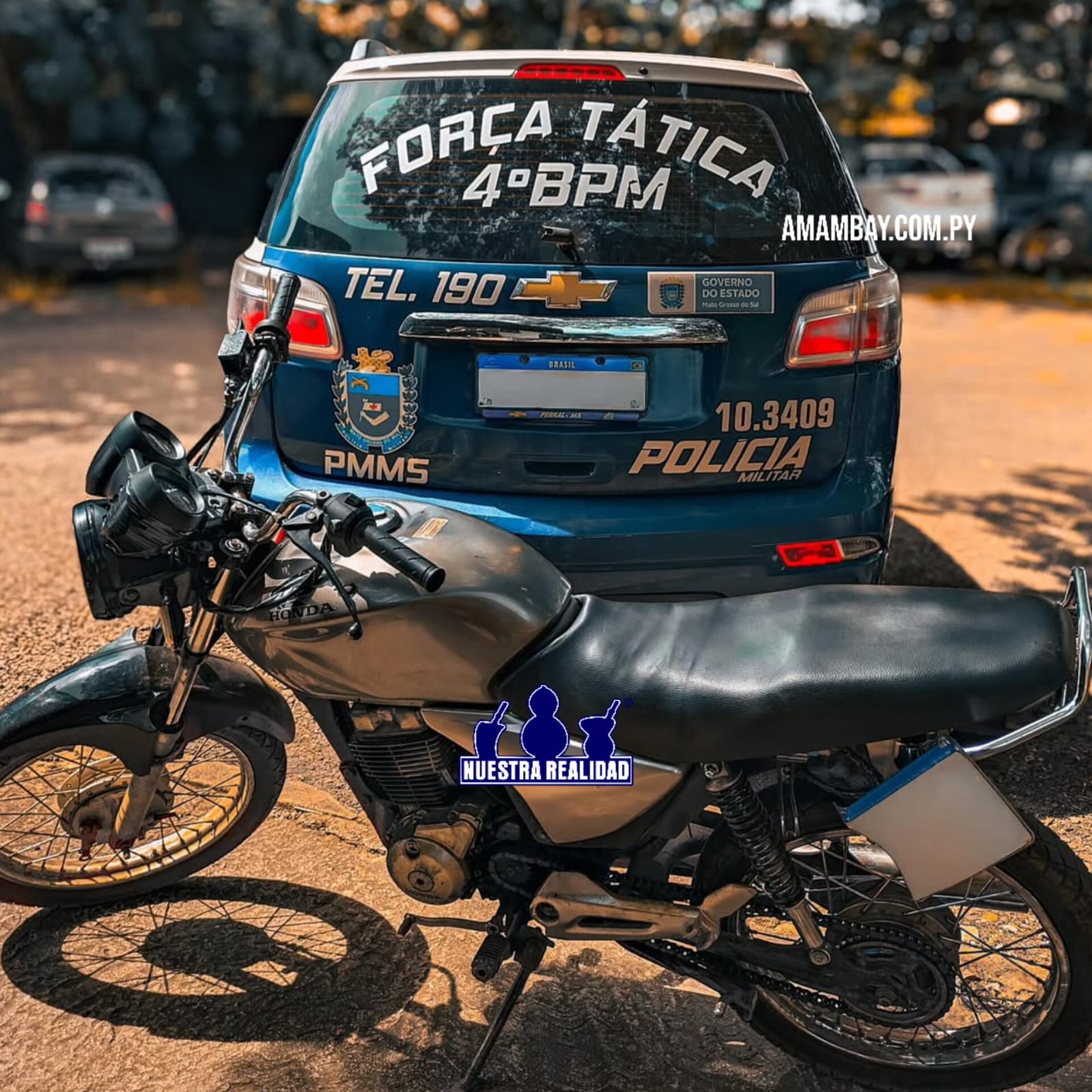 Após a abordagem e verificação sistêmica via INFOSEG, os policiais constataram que a motocicleta Honda CG 150 Titan (cor cinza) possuía registro de roubo ocorrido há cerca de dois meses na capital, Campo Grande/MS.