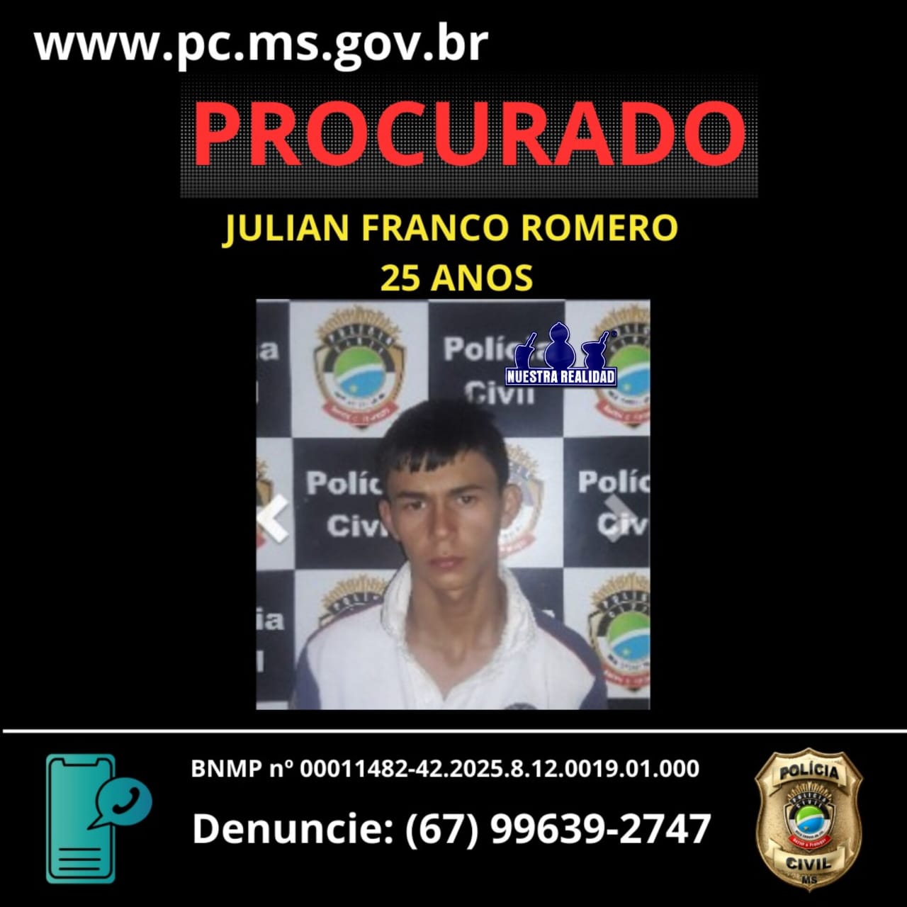 A Polícia Civil alerta que Julian Franco Romero é considerado um indivíduo extremamente perigoso, e solicita que qualquer informação sobre sua localização seja repassada imediatamente às autoridades policiais, garantindo o sigilo da fonte.